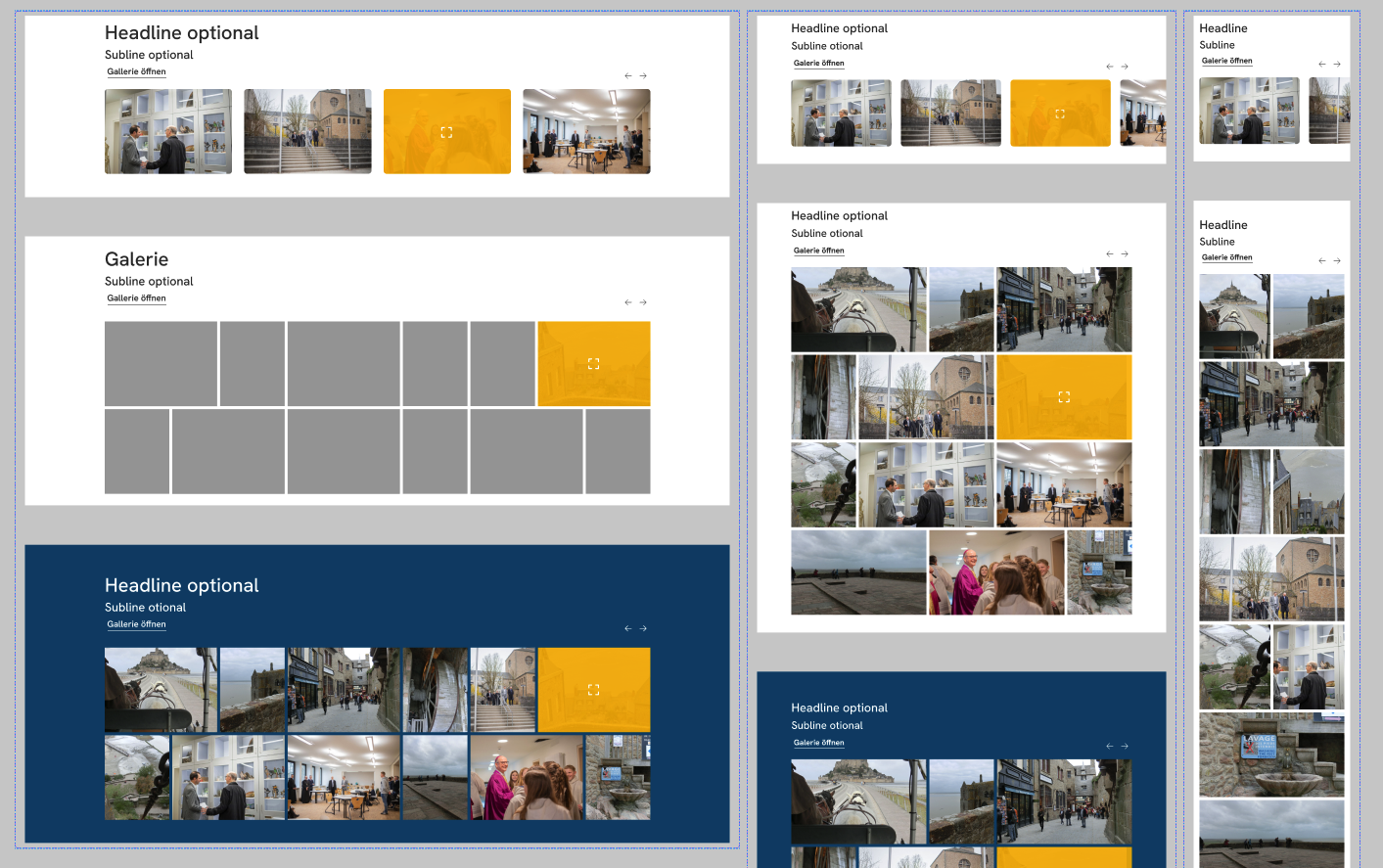 Bildergalerien gibt es mit 4 festen Vorschaubildern, ohne Begrenzug der Bildanzahl sowie als Liste, wo mehrere Galerien dargestellt werden.